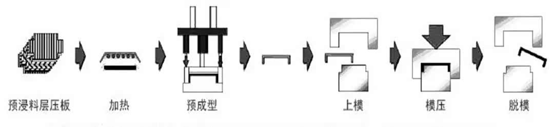 模压工艺是将浸润了树脂材料的增强纤维,如玻璃纤维、碳纤维等进行压实、裁剪,然后放到复合材料叶片弹簧模具里进行压实,并提供一定的温度环境,放置一定的时间后,便可取出进行修边处理,进而成型。工艺流程相对简单,成本也相对较低。但是缺点在于产品的大小容易受设备尺寸的限制。