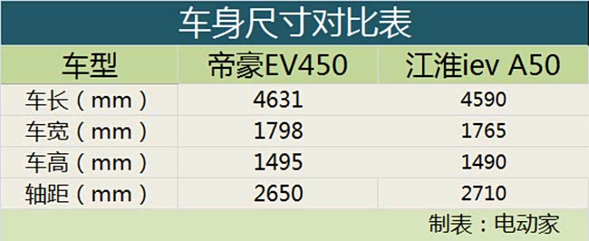 从车身尺寸上来看,帝豪EV450在车身长度上有着一定的优势,因此看上去的感觉会更大气,不过江淮iev A50则在影响车内空间的轴距上扳回一城。