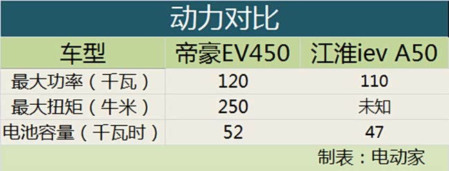 动力方面,江淮iev A50目前公布的信息还不够完善,不过从现在的信息来分析,动力上应该会略逊于帝豪EV450。