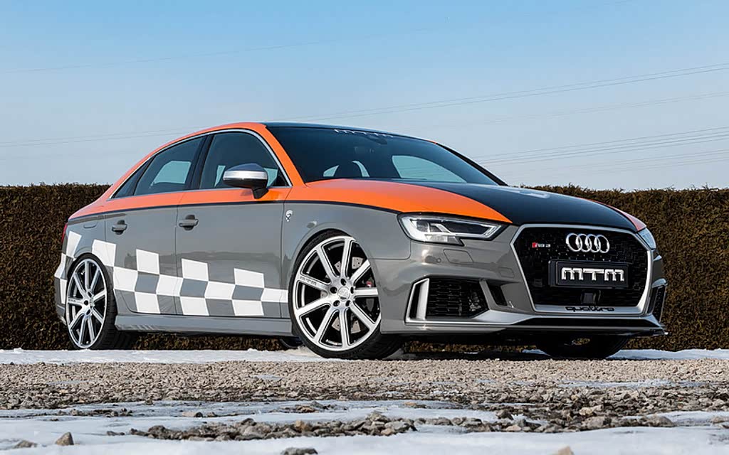 【小车变超跑,奥迪RS 3升级马力达572匹,0-100km/h加速只需 3.55秒!】RS 3原厂马力设定为400匹虽然已经很高,但是升功率在同级中还不是最高的,因此留给玩家的提升空间还很大。 在今年日内瓦车展上,改装品牌MTM就发表了自家操刀改装的奥迪RS 3 R Clubsport,最大马力达到572匹,百公里加速仅需3.55秒! MTM对RS 3上的EA888 2.5T直列五缸涡轮增压引擎进行了一系列的升级,包括换装高流量进气系统,同时换上改装版涡轮头段并将涡轮增压器进行升级,再强化冷却系统。 在为ECU行车电板进行重新撰写后,动力从原厂400匹/481牛米大幅提升到572匹及670牛米峰值扭力的惊人表现!透过7速S Tronic双离合变速箱以及奥迪Quattro全时四驱系统的匹配下,0-100km/h加速只需3.55秒就可完成,直接晋升超跑等级! 为了配合RS 3 R Clubsport MTM的强悍性能,厂方也将轮圈升级至自家的20寸Bimoto 锻造轮圈搭配米其林最新的Pilot Super Sport高性能轮胎,并换上特别开发的可调式避震系统,进一步降低车身同时提升操控表现。另外除了避震以外,也针对ECU甚至是Quattro四驱系统及ESP车身稳定系统等进行重新编程,大幅提升这款RS 3 R Clubsport的操控表现!