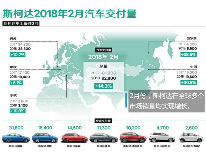 斯柯达在2月创造的历史同期最佳销量,得益于其在全球多个市场区域的“给力”表现。除中国市场销量大涨30.6%以外,在西欧市场,斯柯达累计交付38,300辆新车,同比增长达10.2%。在中欧市场,累计交付新车达18,400辆,同比增长6.1%。东欧市场(不含俄罗斯),共交付了3,100辆新车,同比大涨10.8%,而在俄罗斯与土耳其市场销量增长同样显著,分别交付5,900辆和2,200辆新车,同比大增38.6%和79.3%。此外,在亚洲新兴市场——印度,2月份累计交付了1,400辆,同比增长达16.8%。