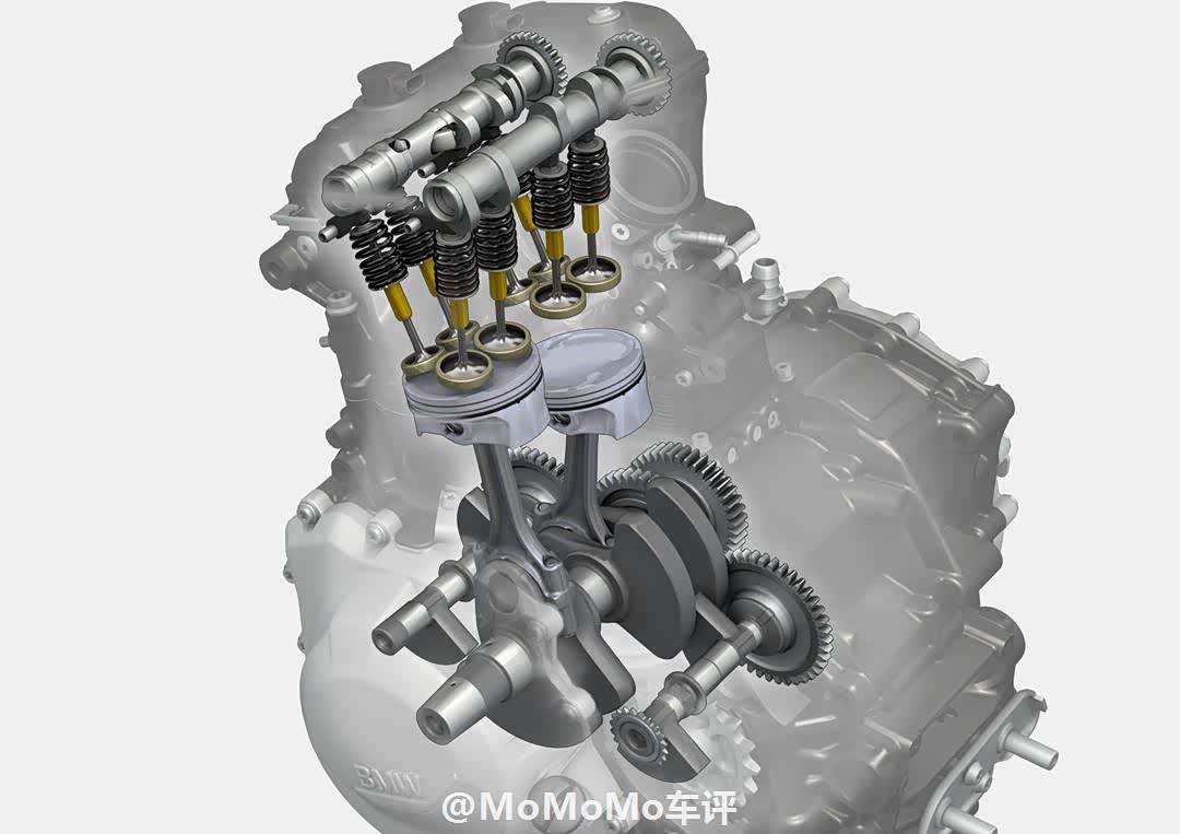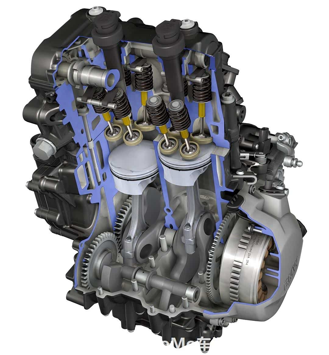 新型F 750 GS和F 850 GS的气缸盖包含两个由齿形带驱动的旋转顶置凸轮轴,每个气缸通四个气门,因此可使用固定速度摇臂。正时链条驱动器位于发动机的右侧。
