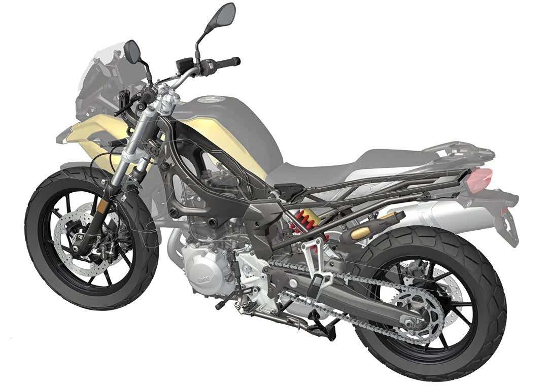 专为新型F 750 GS和F 850 GS开发的车架系统集成了直列双缸发动机作为支撑部件,并由深拉焊接钢板部件组成。与以前使用管状钢制空间框架的型号不同,新型的创新框架采用了单体结构,特别是扭转刚度会得到提高。