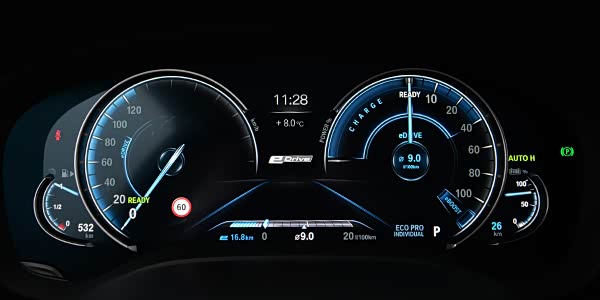 全液晶仪表在三种不同驾驶模式下会呈现不同的显示风格,比起传统动力的5系车型,除了仪表中部的“eDrive”字符外,右侧的油温表也改为了电池电量显示。