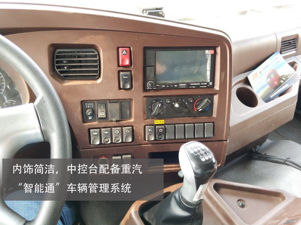 新斯太尔的LOGO置于方向盘正中间,方向盘没有多功能按键。仪表盘也继承了斯太尔的简易实用的风格,行车数据比较全面,观察方便。