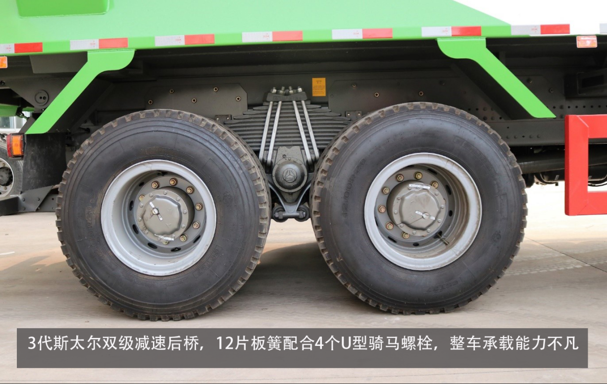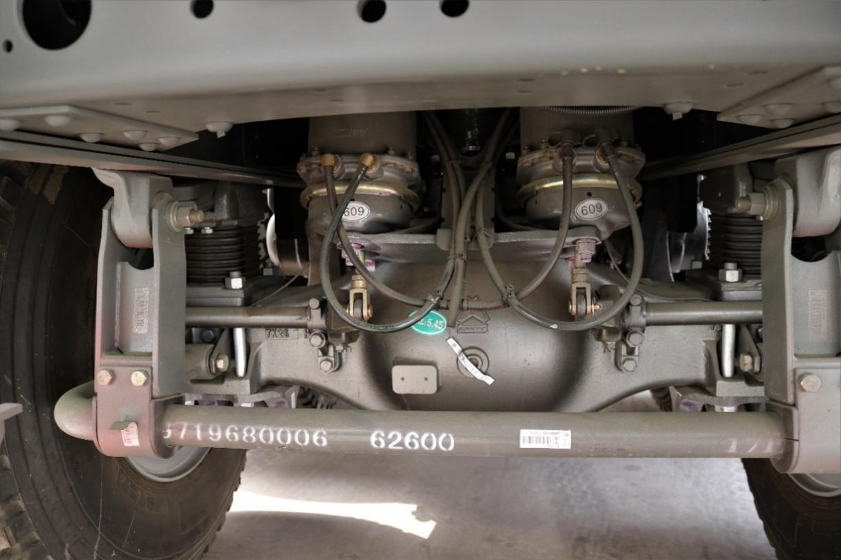 装配第三代斯太尔HC16双级减速铸造驱动桥,斯太尔后桥的可靠性大家有目共睹。另外该车还配有后横向平衡杆,增加了车辆的稳定性。5.45的速比配合一台HW12手动变速箱完全能够满足日常渣土运输需求。