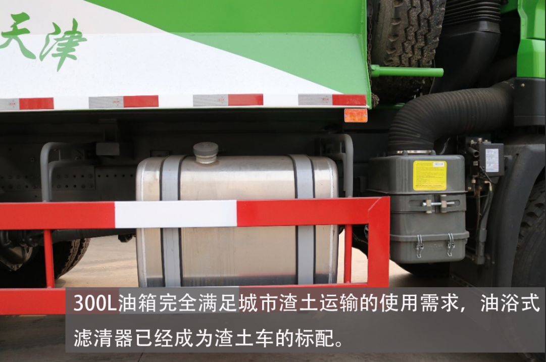 油箱与滤清器均设计在车辆右侧。油箱是300L的铝合金油箱,铝合金材质在使用寿命和自重上均比铁油箱更占优势,不过目前铝合金油箱成本仍然较高。针对渣土车特殊使用工况,滤清器采用加大油浴式滤清器(油浴+空滤已经成为了保护发动机的标配)。