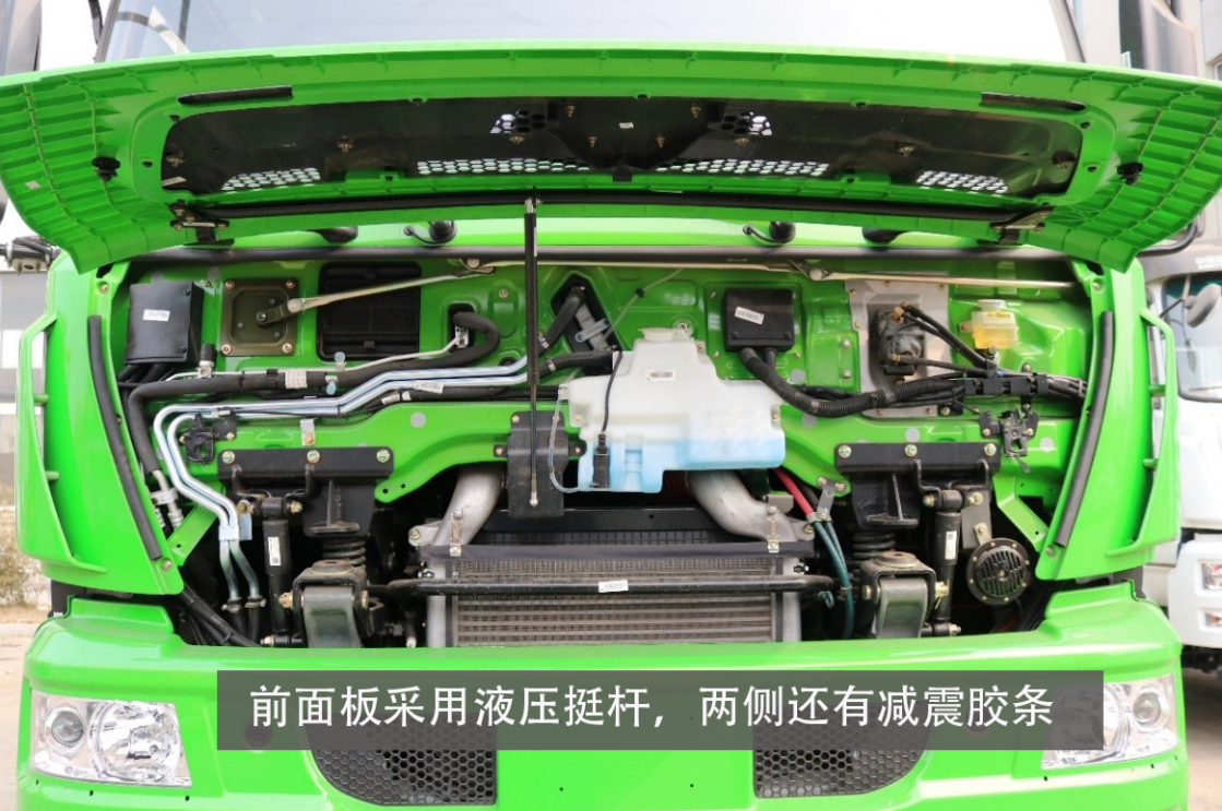 掀开驾驶室前面板我们可以看到,驾驶室前面罩采用单液压挺杆的设计。内部管线布置简洁,空调管路外侧包装有橡胶管以防管路摩擦。近些年车型在设计时,管路摩擦防护上有了很大改观。渣土车的运输环境较为恶劣,中冷器外有可拆卸式防虫网,方便随时清理春季柳絮、树叶等,避免粘住中冷器。驾驶室前螺旋减震支撑座采用铸造工艺,在车辆发生碰撞时可溃断,保证行车安全。该车采用国产转向机,高配车型配备有采埃孚转向机。