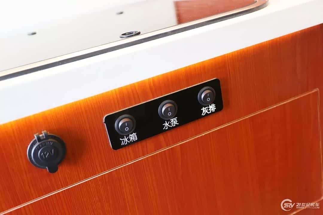 厨房桌面下方带有冰箱、水泵及灰水箱排水阀开关,在开关左侧还设有一个12V电源插座。