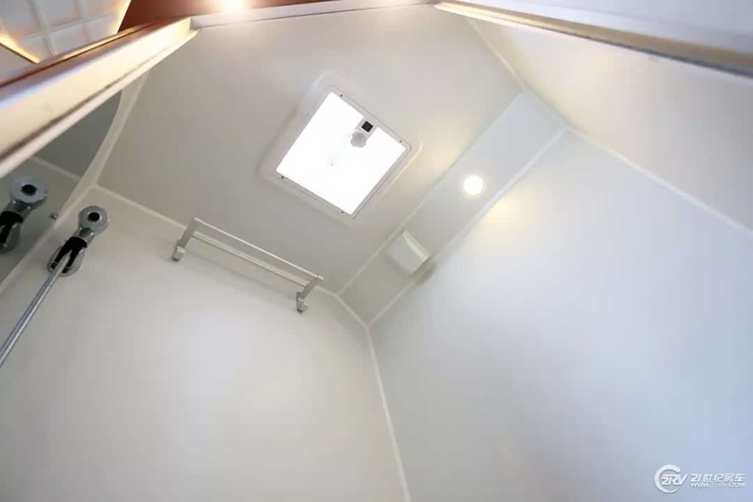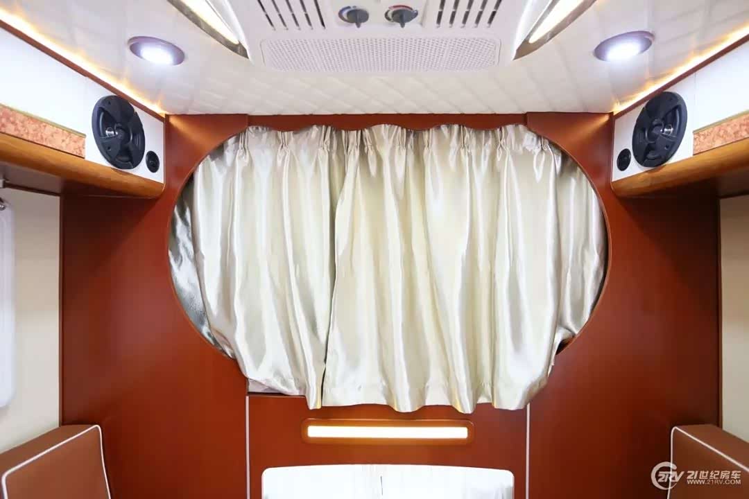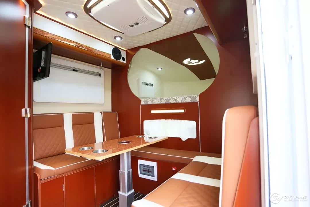 车顶全部采用软包处理,并带有3盏照明灯,车顶中央为顶置驻车空调,四周还配有木纹饰板及条带式照明灯。