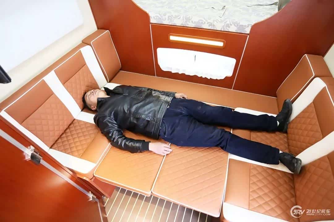 额头床布置在驾驶室上方,不受双排驾驶室影响,空间十分充足,床位尺寸为1950×1950(毫米),容纳两名成年人休息不成问题,床位的垂直空间也表现不错,入口处床板至车顶的垂直距离为800毫米,乘客能够勉强坐起。