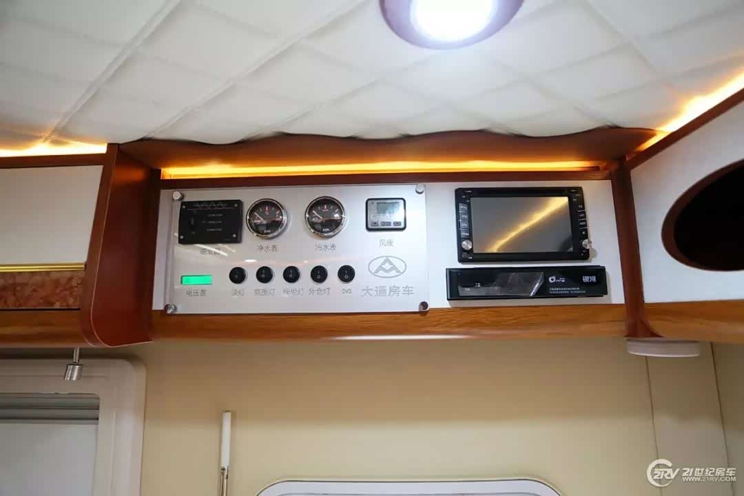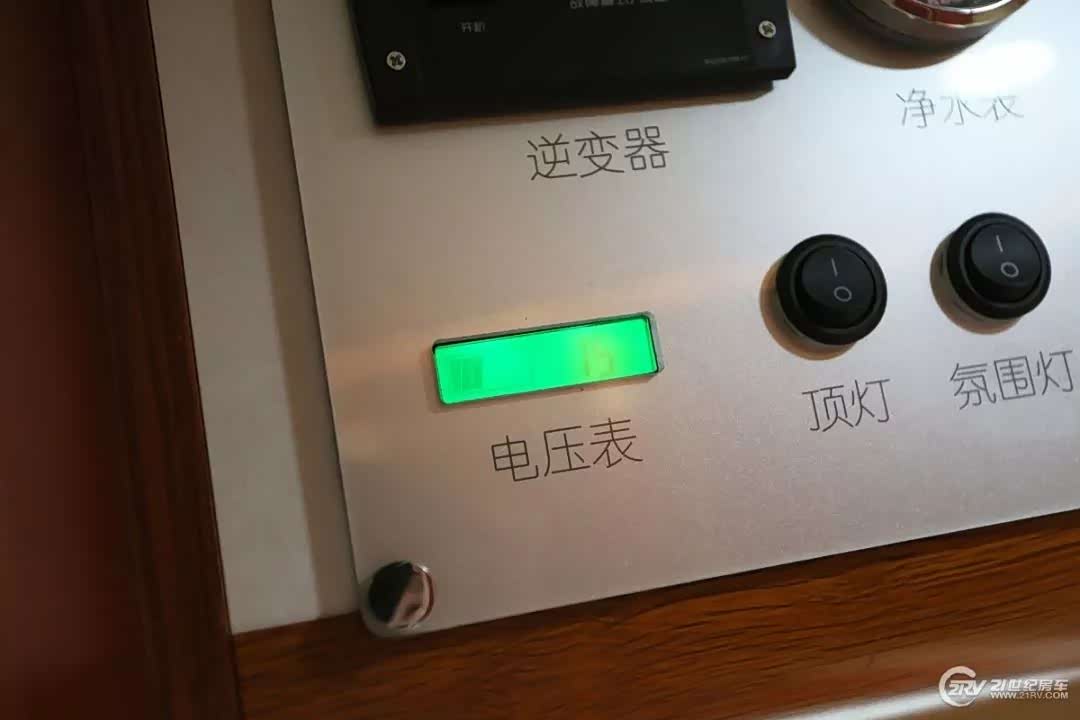 乘客门上方为生活区控制面板,集成有照明开关、逆变器开关及水箱水位表等。