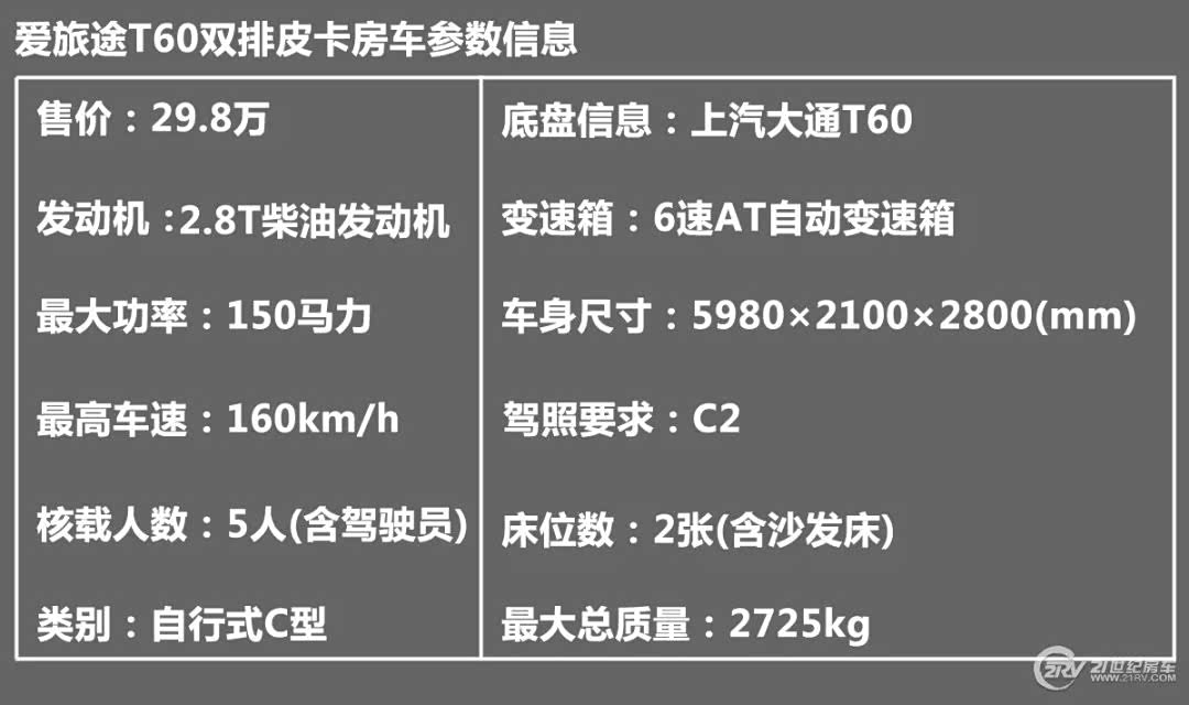 爱旅途T60皮卡房车的整车尺寸为5980×2100×2800(毫米),车身高度不含顶置空调,整备质量为2725千克。