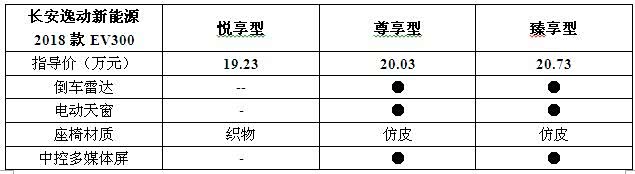 长安逸动新能源2018款EV300(低配款不含)搭载的中控多媒体屏为7英寸,下方设有实体功能键,设计上没有标新立异,中控屏涵盖倒车影像、GPS导航、手机映射等功能。接下来我们来看一下三款车型的主要差异: