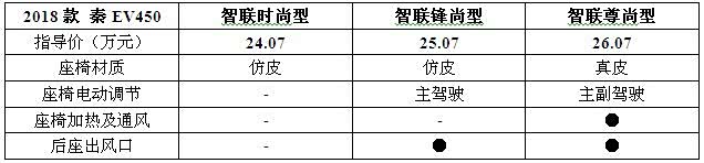 比亚迪秦2018款EV搭载的中控多媒体大屏为12.8英寸,周围没有设置实体键,空调控制等均通过触摸调整,整体画面设计比较普通。中控屏标配倒车影像、GPS导航、车联网等功能。接下来我们来看一下三款车型的差异,主要体现在舒适配置上: