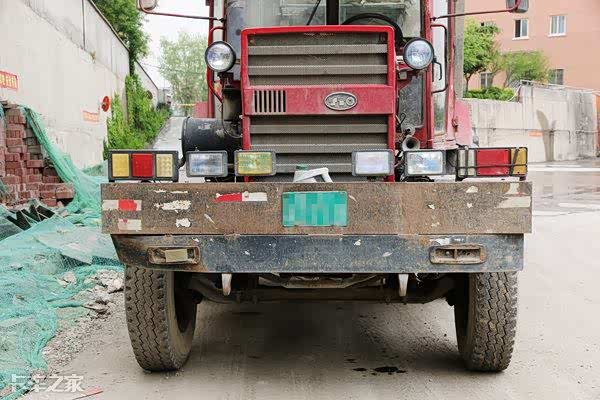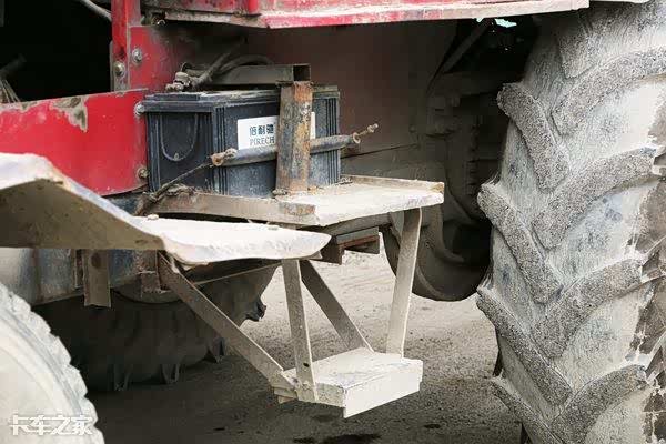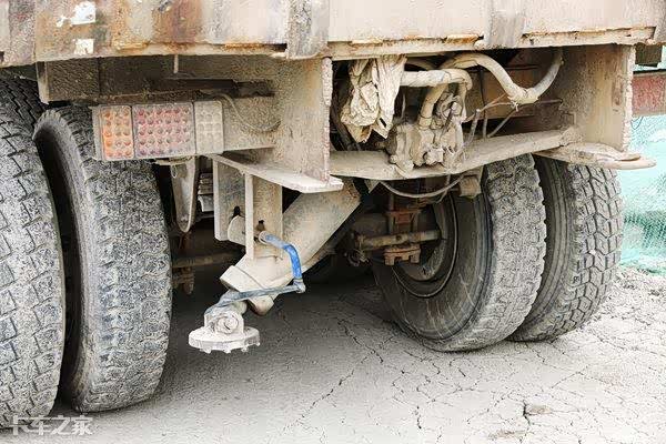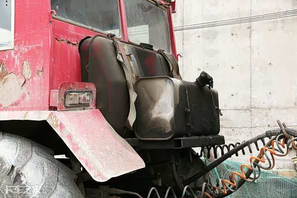 驾驶室后面布置了一大一小两个油箱,其中大点的油箱为柴油箱,为车辆提供动力来源,小油箱为液压油箱,为挂车侧翻油缸储存能量。黑色的油泥为原车漆提供了很好的防护,不再惧怕风吹日晒。旁边的尾灯和转向灯看来材质稍微差点,因为灯泡烘烤的原因,尾灯灯罩已经出现了严重的变形,这是目前这辆车上我发现的唯一槽点。