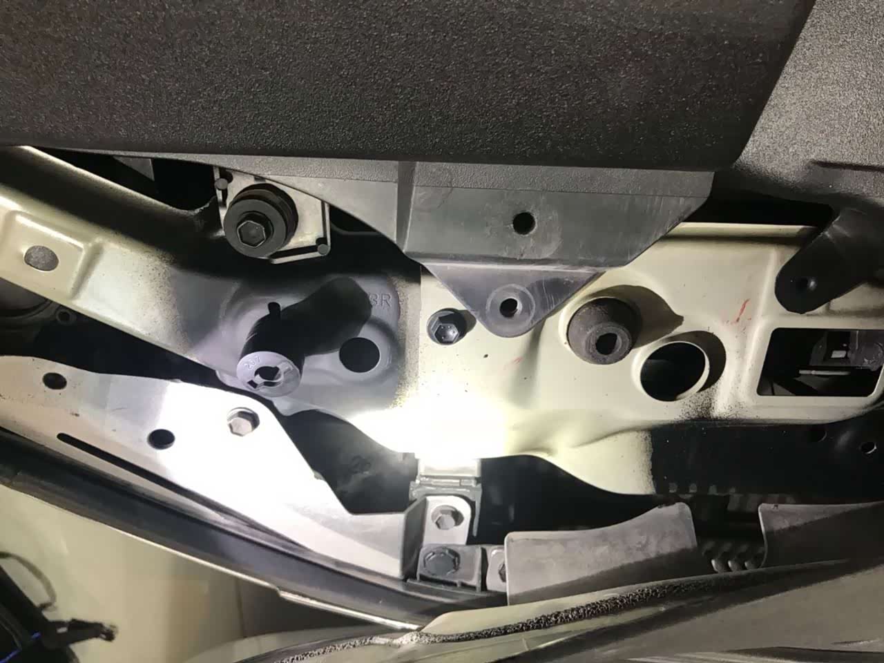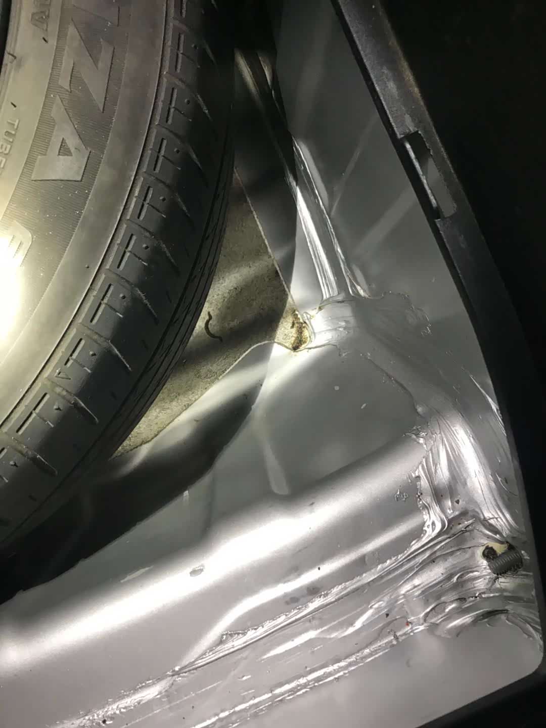 在龙门架的底部、叶子板的内部发现了变形的痕迹、在后期修复的过程中上面还打胶的痕迹,看来左侧有轻微的碰撞,并没有伤及骨架。