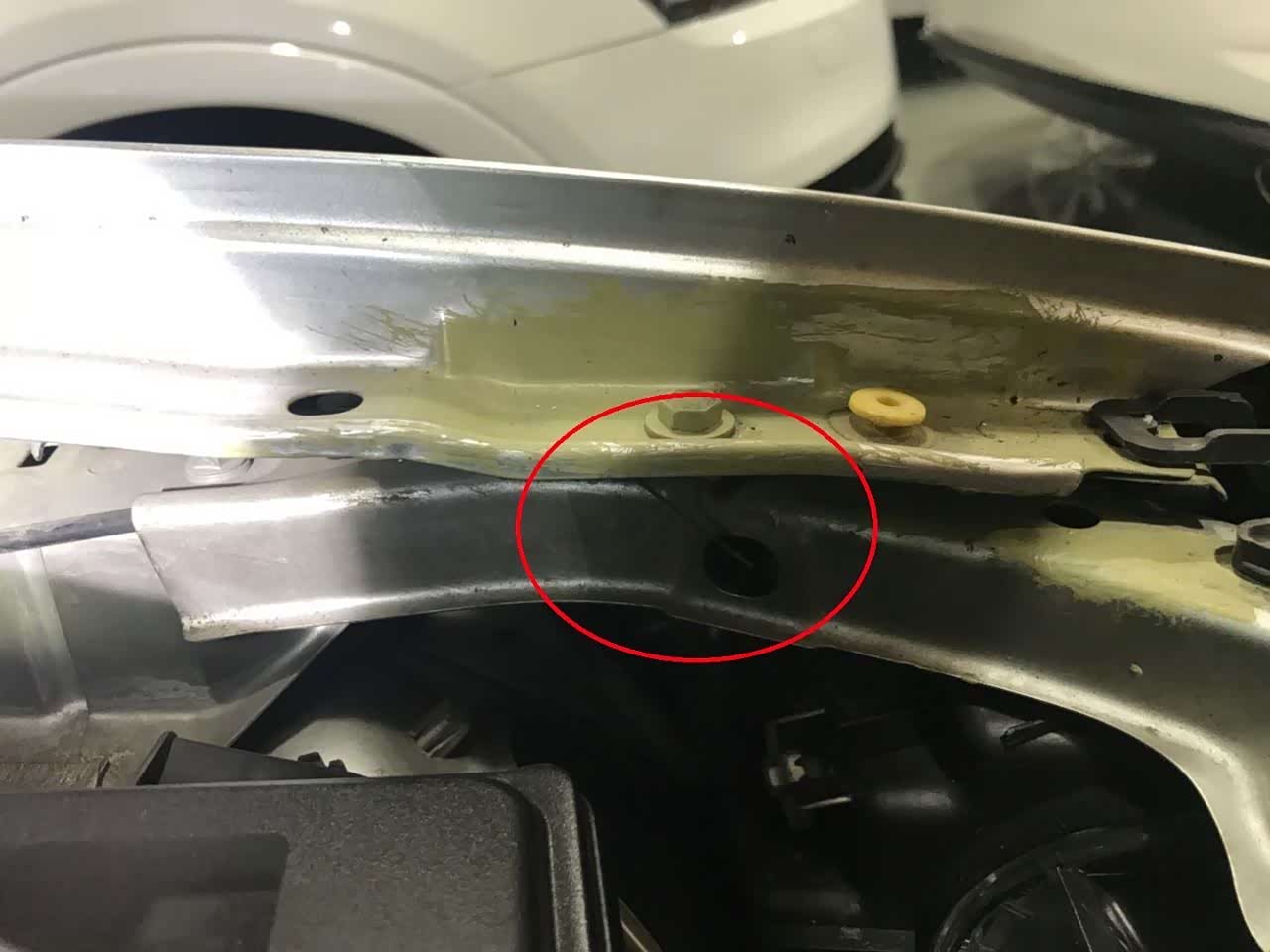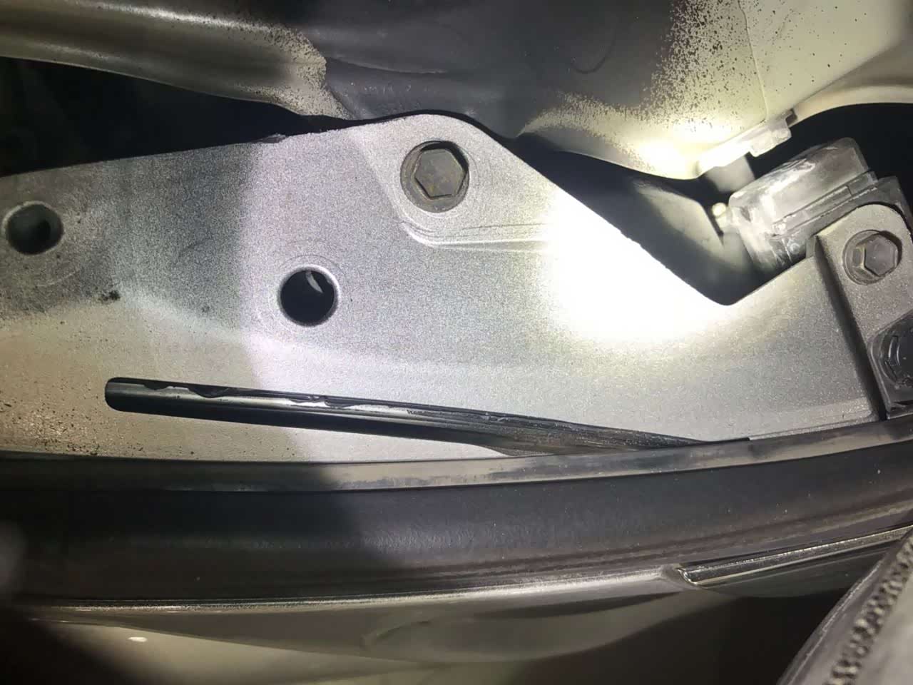 检测到左前叶子板的时候那么问题来了、叶子板与龙门架的接触位置发现了焊接痕迹,如上图所示,看上去也是很明显焊条还在上边、这是叶子板在更换的过程中所导致的、至于黄色的那玩意就是防锈胶,只能说打胶打得太不走心了。