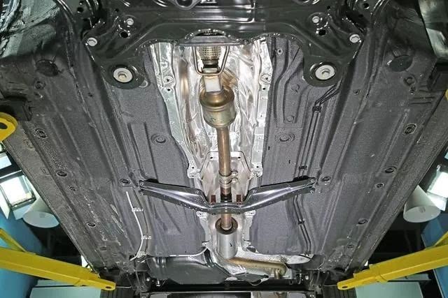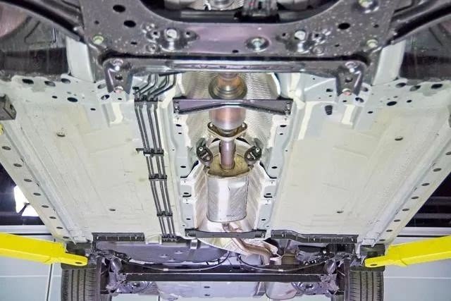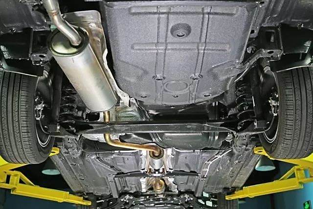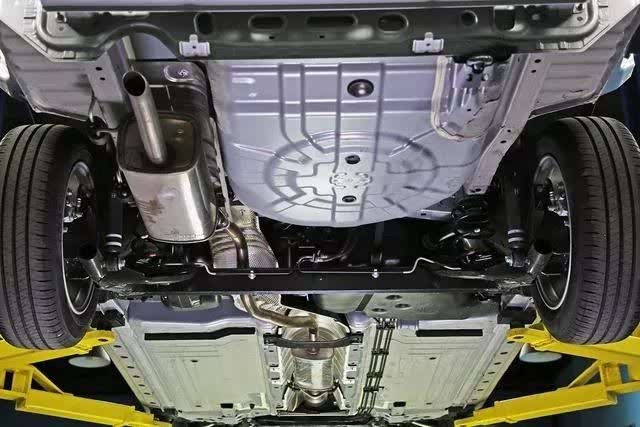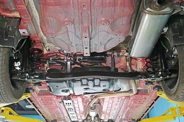 轩逸乘员舱底板较为平整,中央排气管通道配合左右两侧门槛梁为车身提供框架支持。车身前纵梁延伸到乘员舱前部就结束了。