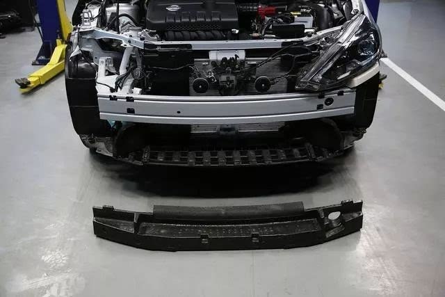 轩逸前部防护结构包括保险杠外壳、二级缓冲层、防撞梁和吸能盒四部分,其中防撞梁为钢制,侧断面为凹字造型,防撞梁本体为闭合形式。