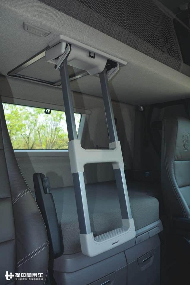 平地板车型空间从来不是问题,S系成为斯堪尼亚第一款地板全平的重卡,内部高度2070mm(官方数据),都是一米多的人,在车内完全直立行走绝对没有问题。顺便说一说R、G驾驶室的内部实测高度,从地板到天窗中间位置,R系Highline驾驶室内高1930mm,G系Highline驾驶室内高1745mm,G系Normal驾驶室内高1515mm。
