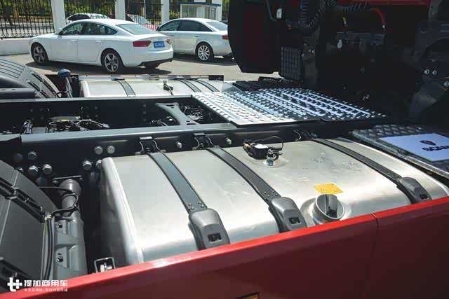 底盘左右两侧各一个500升油箱,总容积1000升,这也是6x2驱动车型标配的油箱尺寸。4x2牵引车会提供500+700升或600+700升两种容量,适应快递快运长续航的需求;6x4普货牵引车则是400+500升油箱,6x4危险品牵引车为符合国家新规,只有单个400升油箱。