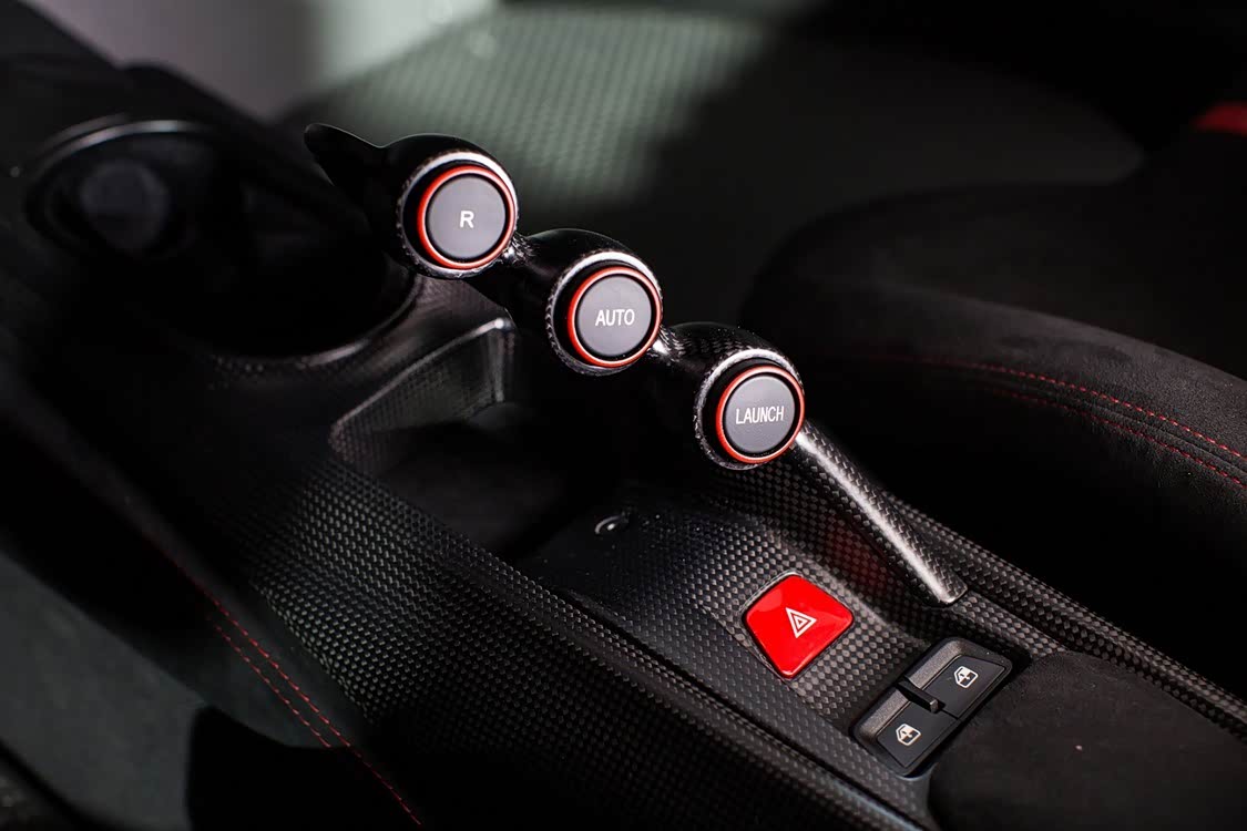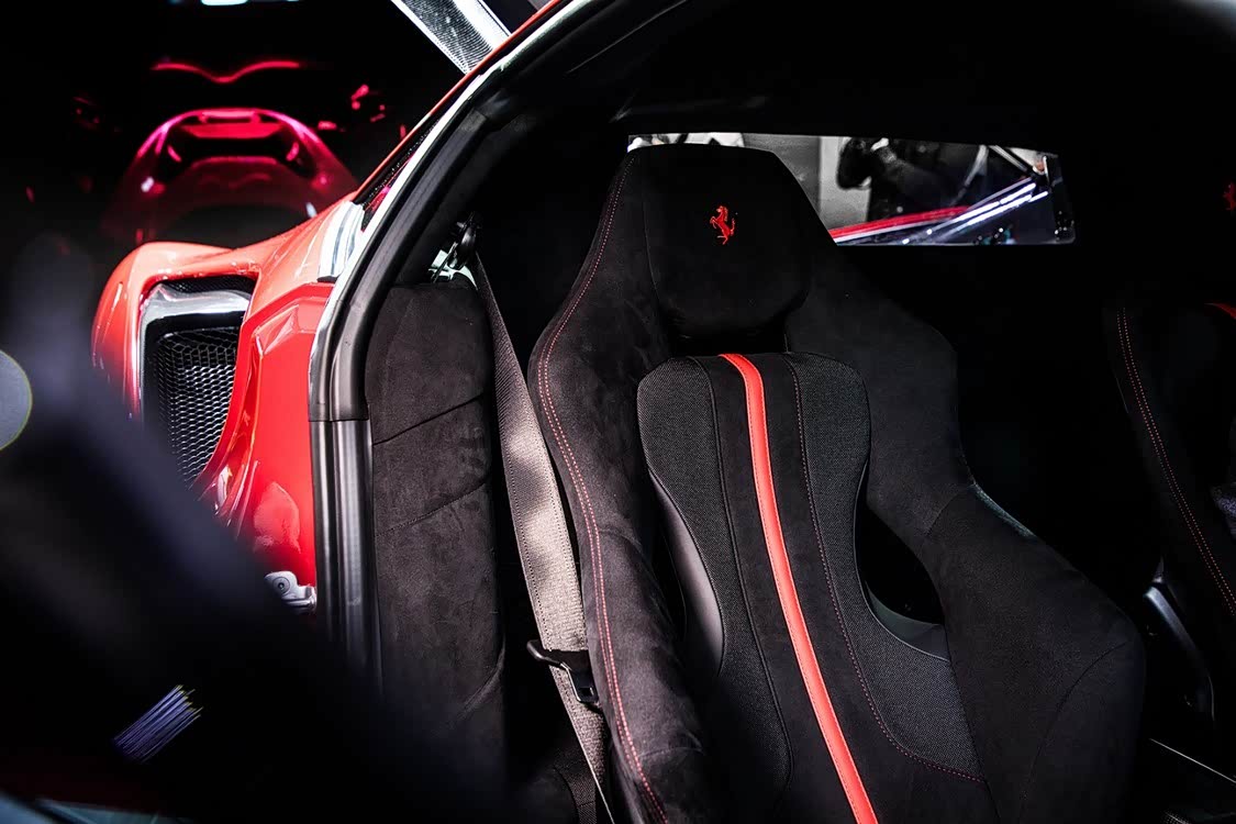 一台以赛道取向和性能为主的超跑,大量碳纤维材质和 Alcantara 材质把内饰包围起来,内饰只需要基本的配置就好,甚至……空调都会有些多余了。开个玩笑,法拉利把它打造成赛道机器,但又能兼顾日常使用的全天候车型。
