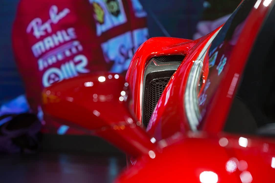 两个巨大的风道可不是装饰而已,它引导气流从车鼻中间的风道流过前盖。另外法拉利重新设计了车辆前部的散热器布局,运用中冷器吸入的进气流,将热力边界层以及前部散热器热气流产生的干扰降至最低。
