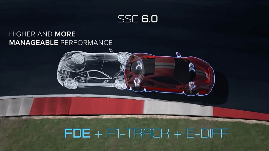 升级了新一代侧滑控制系统(Side Slip Control System ,简称SSC 6.0),提升刹车系统效率,此外法拉利动力强化系统(Ferrari Dynamic Enhancer)是全新的功能,整合在 SSC 6.0 侧滑控制系统中,该系统可调节侧滑角度预测值等横向动力变量,还可提前干预,在过弯时轻微启动卡钳(Manettino旋钮处于 “CT-OFF”时),让驾驶员能更大信心,可以更轻易化解转向过度的情况。