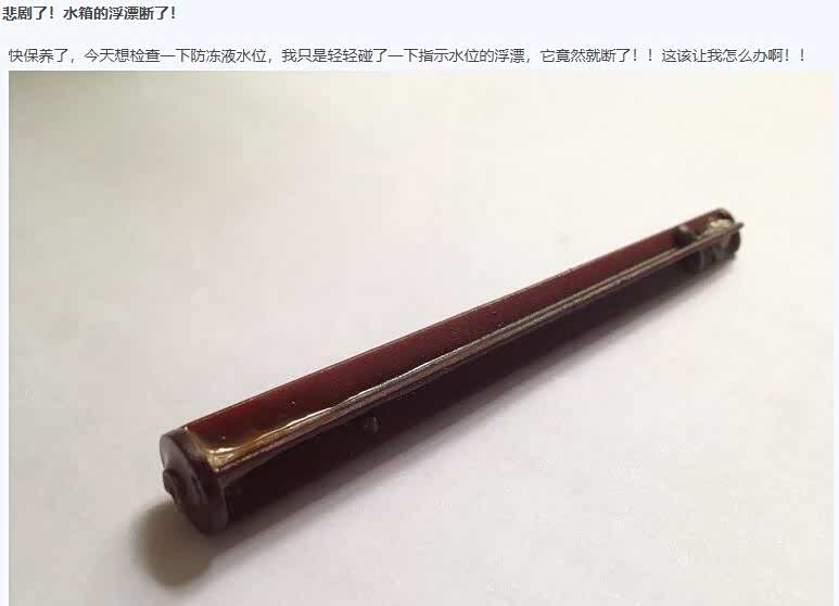 宝马副水壶的设计也很奇葩。可能是宝马不甘于和其他普通品牌设计得一样,并没有像一般汽车一样,弄个透明的副水壶画上两根刻度线,简简单单地解决液面标注问题。宝马是弄了个黑色不透明的副水壶,拧开盖子会弹上来一个浮漂,通过浮漂高度来标注液面高度。虽说是有点脱了裤子放屁的感觉,不过也是可以用的。但你这浮漂倒是做结实一点啊!我就轻轻碰了一下浮漂,浮漂居然断了!我当时赶紧上论坛发帖问大家怎么办,底下的回复都是“没事,我的也断了”。