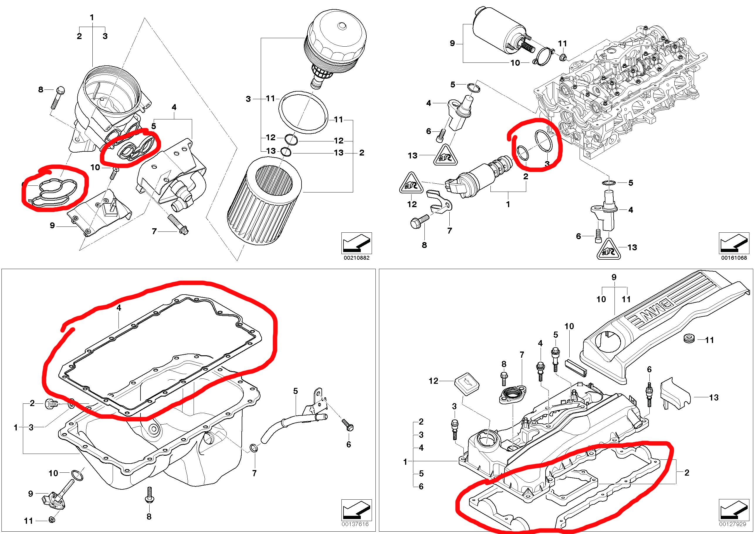 主要漏油点有:机油冷却器垫,机油滤座垫,VANOS电磁阀密封圈,气门室盖垫,油底壳垫,真空泵密封圈。其中绝大多数还是比较好换的,价格也不贵(几十块),动手能力强的甚至可以自己趴在发动机上换,需要拆卸的零件不多。