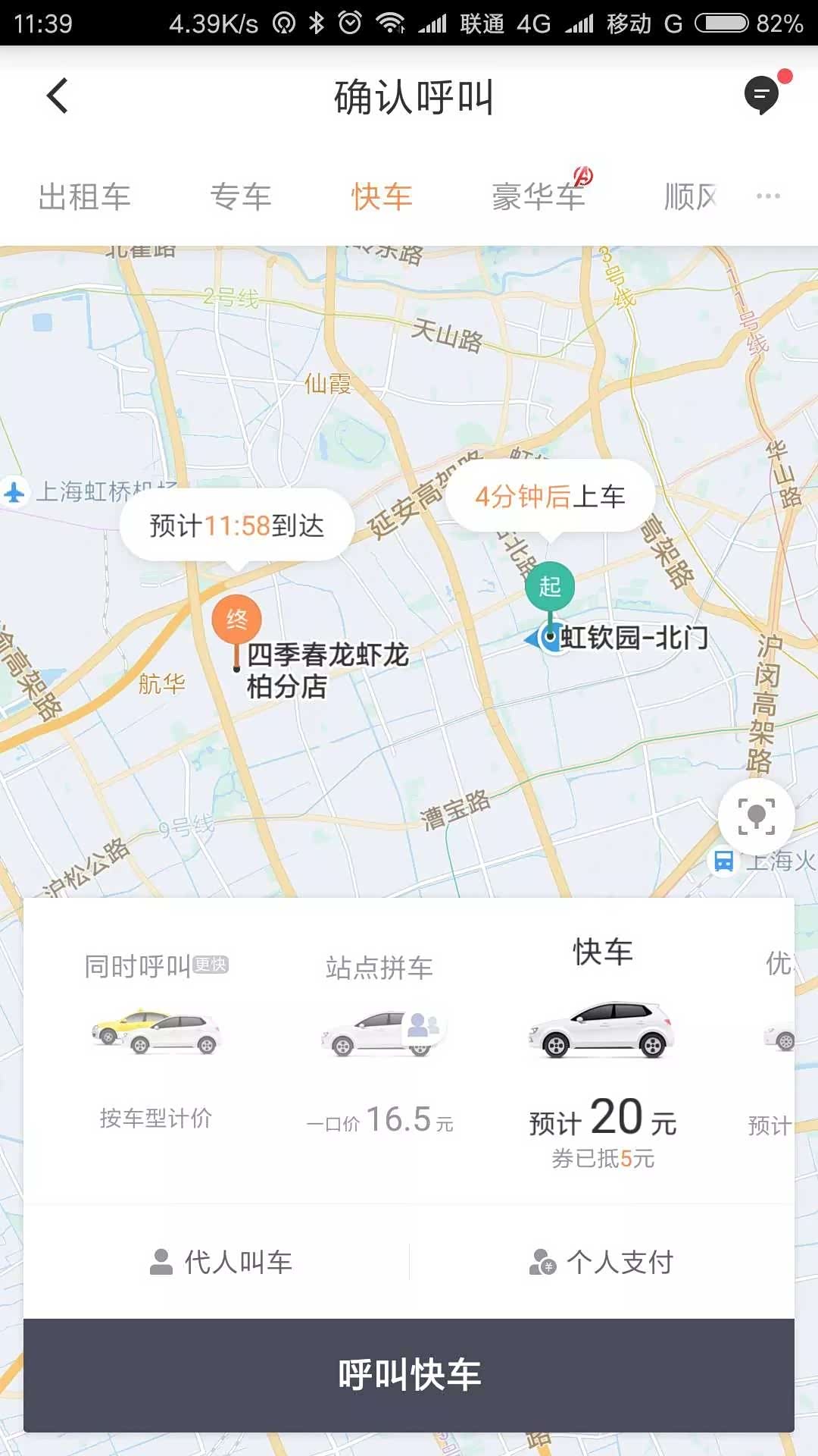 可以看到,在设置了相同的起点和终点后,滴滴给出的快车预估价是一致的,都是用5元券后20元。