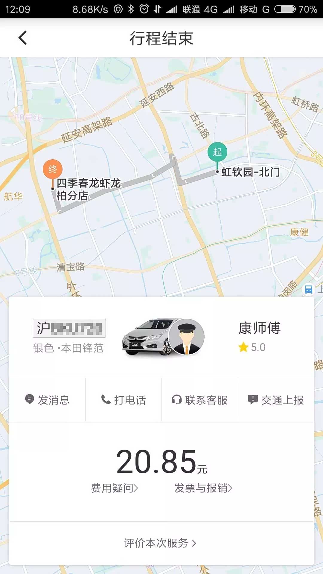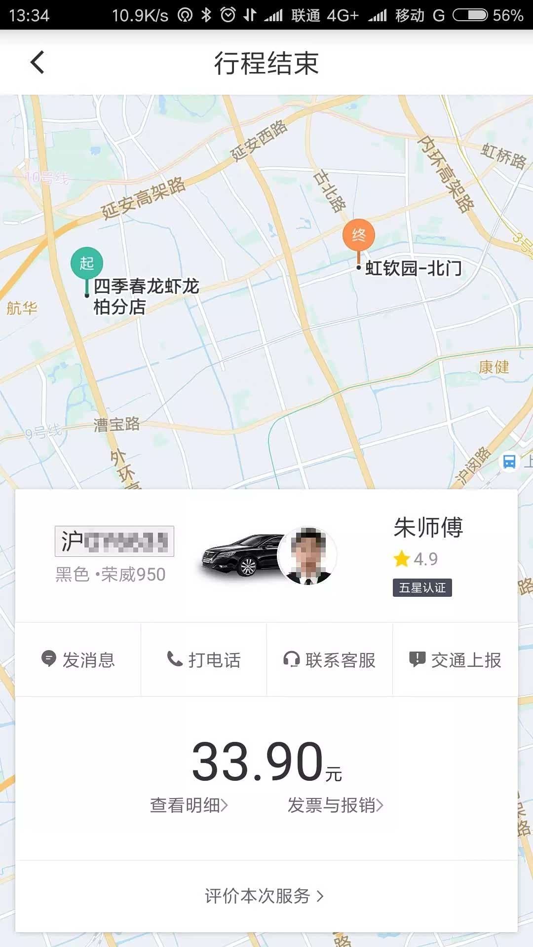 为了进一步论证,我们返程时同样是一部苹果手机和一部安卓手机,但这次我们选择乘坐滴滴专车,并且两台车一前一后跟随行驶,同时出发,同时到达,看看这次结果会怎样。这次苹果手机为不怎么使用滴滴的白银会员,安卓手机和上次实验相同,依旧为黄金会员,苹果会员级别低于安卓。