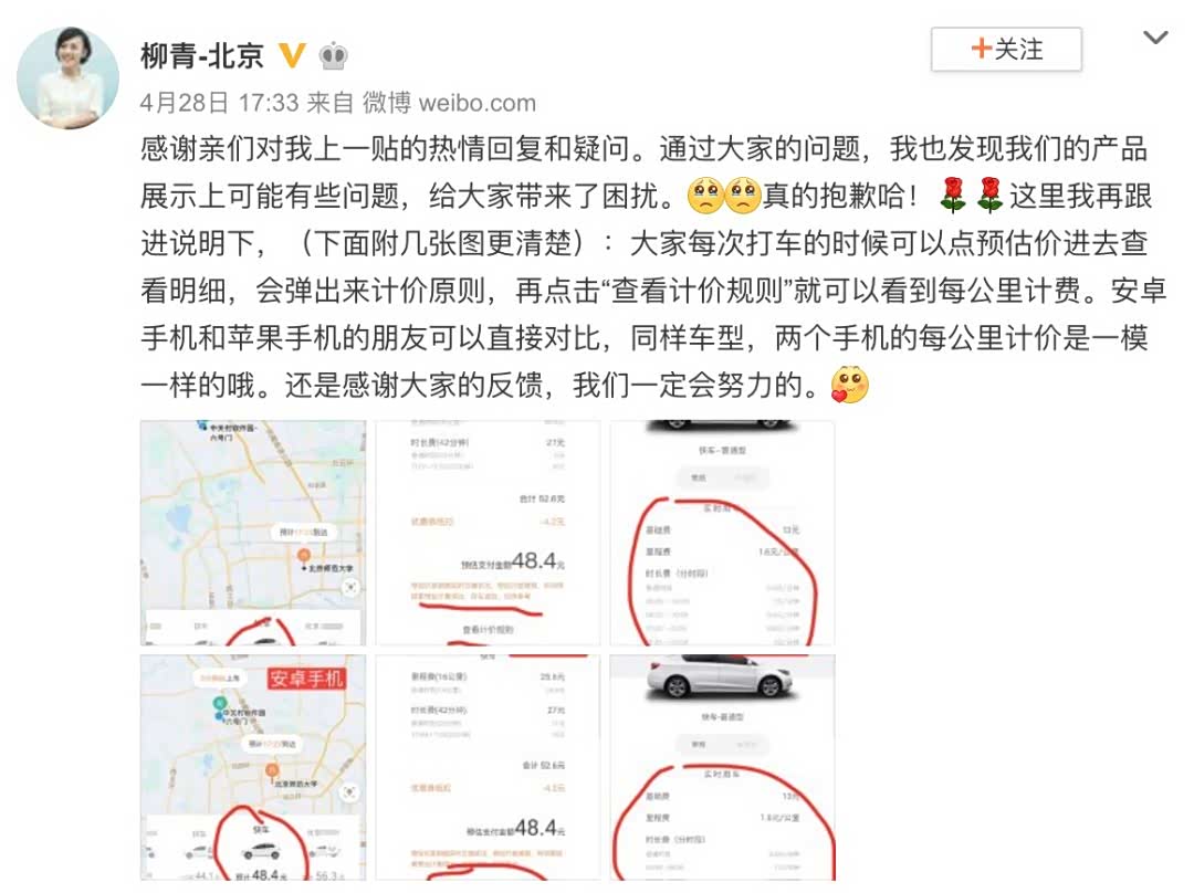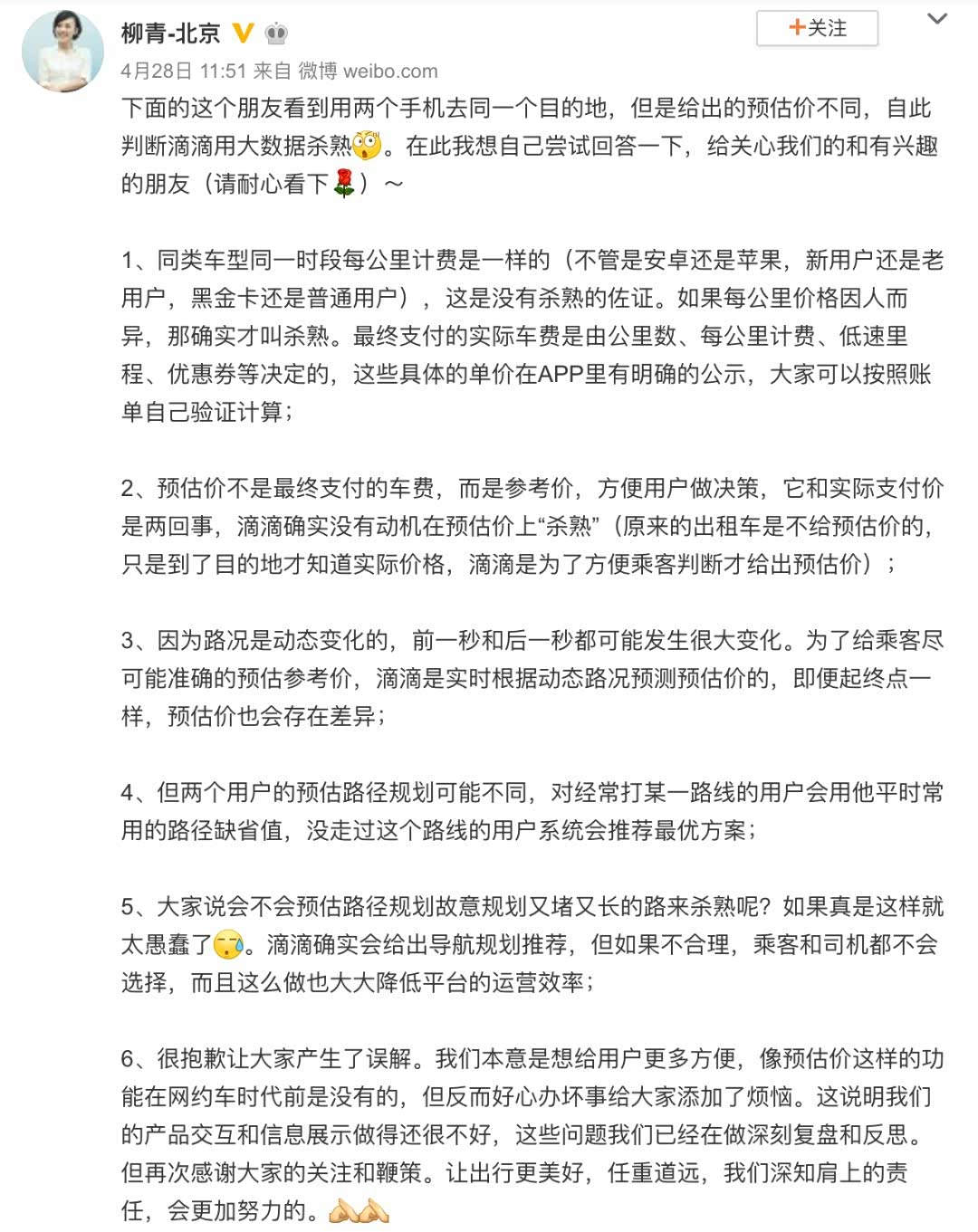 被网友和媒体曝光存在杀熟现象后,已经近两年没有发过微博的滴滴总裁柳青一天之内连发两条试图予以澄清。
