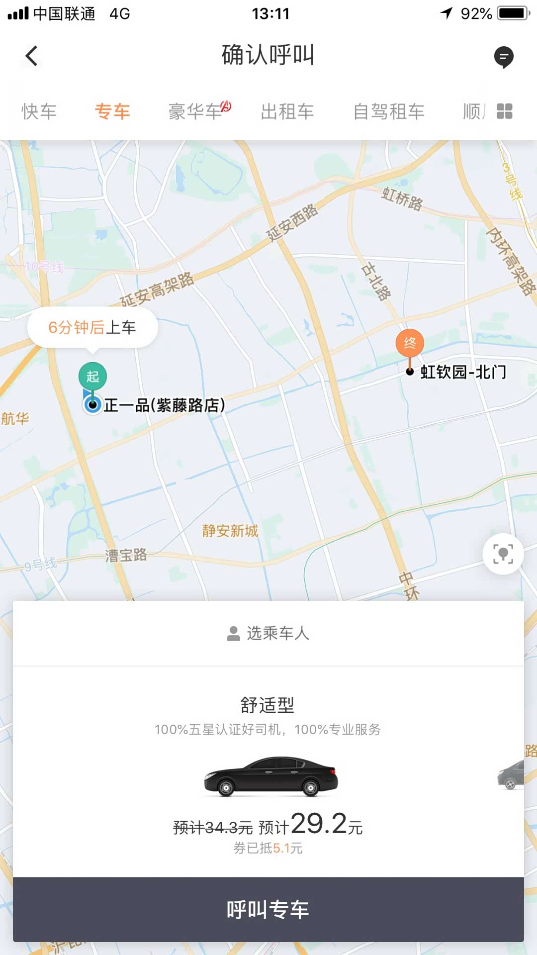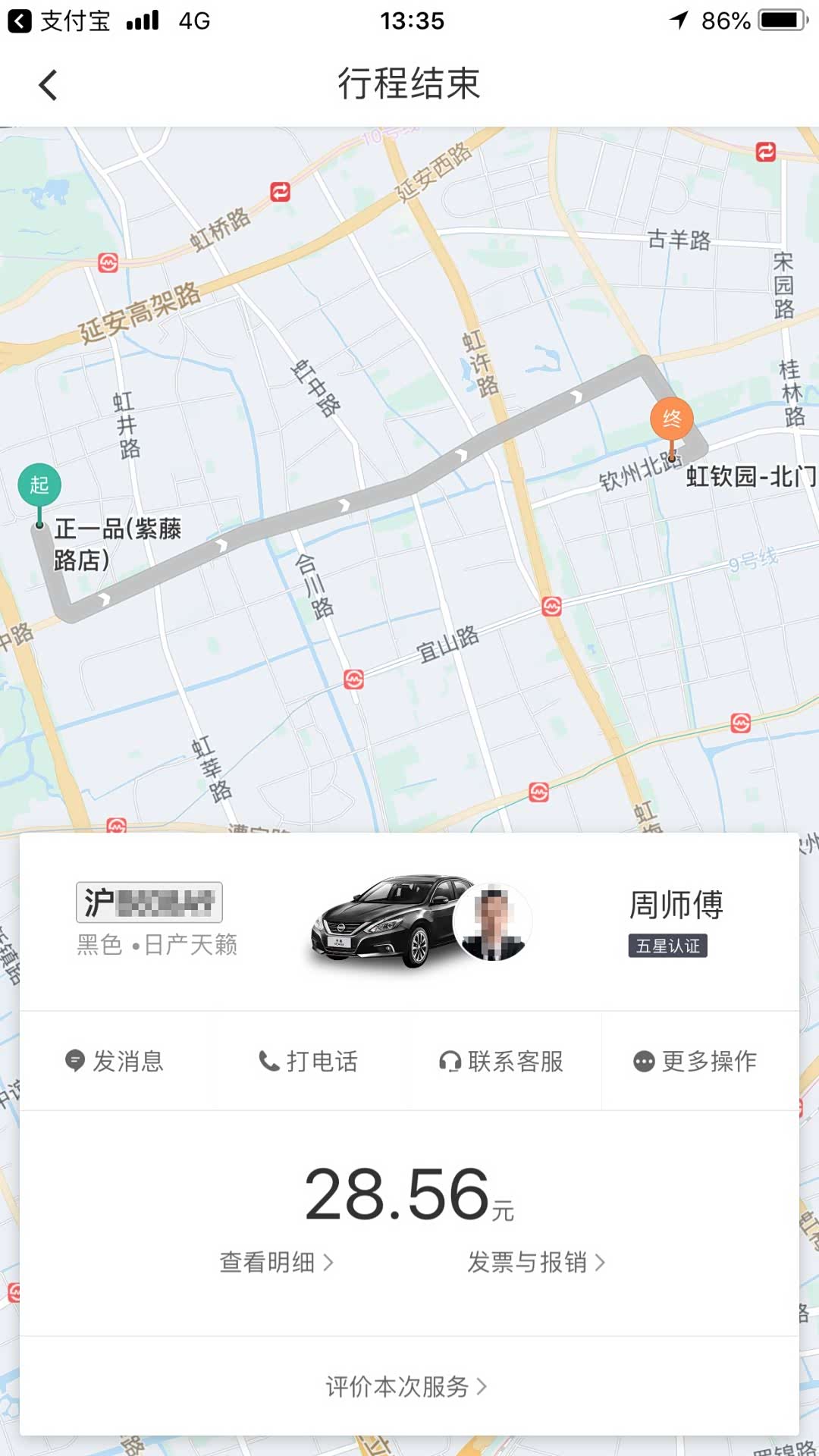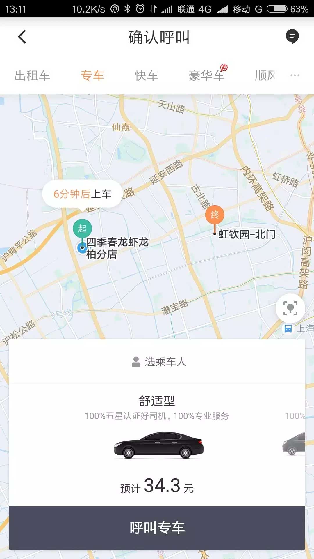 虽然起点是两家店,但这两家店位于道路两侧,直线距离不到10米,终点相同,呼叫专车后,滴滴给出的优惠前预估价也一致,均为34.3元。我们看看行程结束后是否一样。