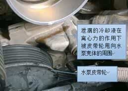 水泵泄漏是比较常见的故障,主要是因为密封做得不是很到位,发动机靠近水泵部位漏水。漏冷却液会在水泵通风孔上留下冷却液颜色的痕迹,导致缺少冷却液后水温高等症状的出现,而同时冷却液泄漏到水泵的轴承上后,会对轴承上的润滑剂进行冲刷,导致轴承磨损损坏。