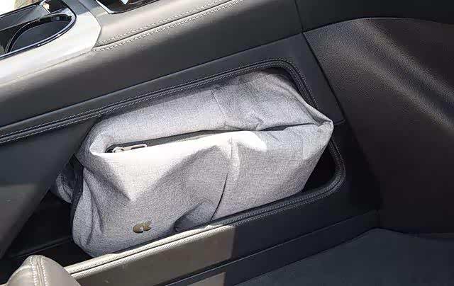 再如换挡杆下方的巨大储物空间,上面还有挂钩。可以放下女士的包和高跟鞋,或者挂小物件。虽然副驾手套箱没了,但丝毫不用担心没地方储物。女性出门都要带个包,传统汽车的手套箱太小,根本放不下大包,更放不下高跟鞋。这个储物位置足够大,对女性来说很方便。