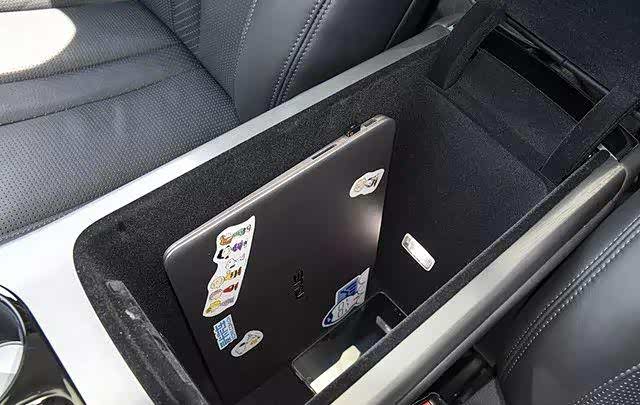 再如中央扶手的安全箱。分为上下两层,上层放小物件,下层可以放两个大型笔记本电脑,还可以设置密码锁。将钱包、电脑锁在里面,不用担心被盗。
