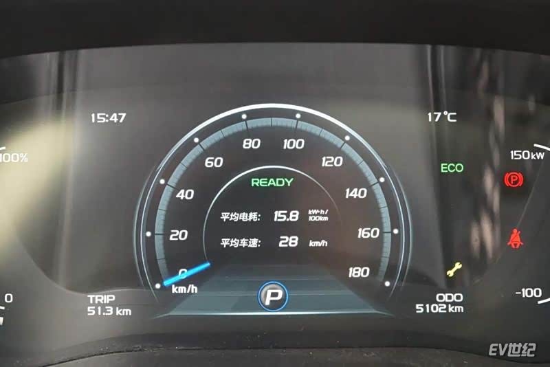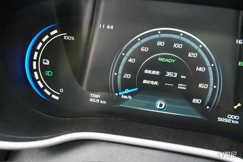 第一段行驶路程为南五环路,道路畅通,平均时速在80km/h以上。在行驶了40.9公里后,车辆显示的剩余续航里程为353公里,多减少了6公里。