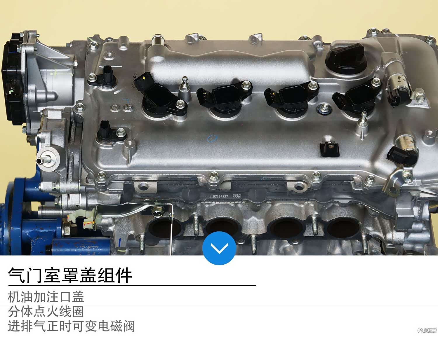气门室罩盖上方设置了机油加注口,进排气正时可变电磁阀,四支独立的点火线圈和凸轮轴位置传感器等。