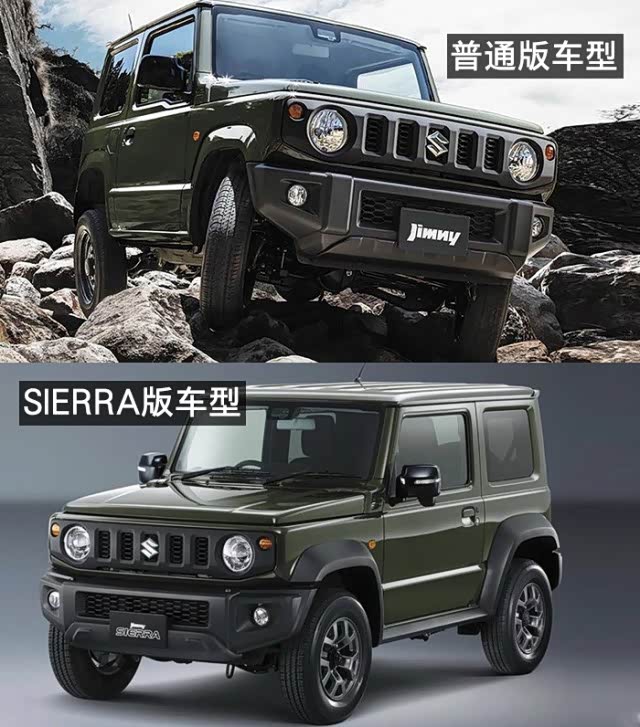 新一代吉姆尼仍然保持了历代车型经典的方盒子造型,整车以大量平直的线条和直角折线构成,相比现款车型更加的硬朗,这样设计还带来一大好处就是最大限度的保证了车内空间。为了针对全球市场和日本国内市场的不同要求,新一代吉姆尼也有两个版本的车型,分别是符合日本K-car标准的普通版车型和面向全球的Sierra版车型。普通版车型取消了会影响到整车宽度的黑色塑料轮眉、侧踏板等外饰套件,与之匹配的轮胎也采用了窄胎的设计。Sierra版车型则跳出了K-Car法规的限制,增加了具有肌肉感的轮眉,并且前保险杠面罩的也随着轮眉的使用而变得更宽。