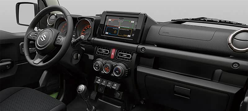 以2018年普通车的标准来审视吉姆尼的内饰设计绝对是不及格的,但是考虑吉姆尼是一台彻头彻尾的越野车也就可以接受了。整体设计语言还是横平竖直的硬朗风格,不过中控台加入的大屏幕算是跟上了现在的潮流,空调控制仍然还是旋钮式,最符合车型定位的变化当属分动箱模式切换从第三代车型的按键式换回档杆式。在垂直的A柱作用下,就空间上来看新一代吉姆尼给人的通透感和空间尺寸都非常不错。