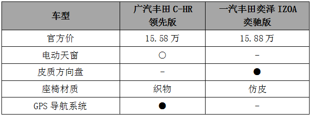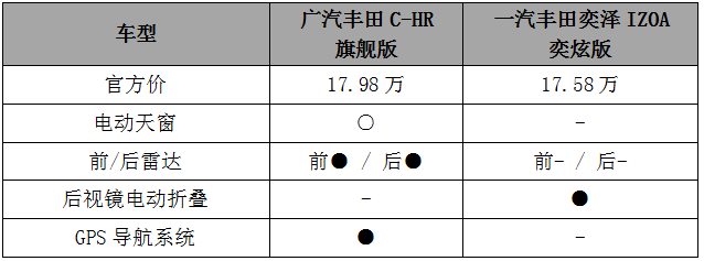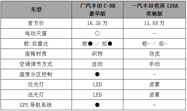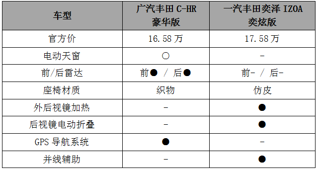 再来,拿C-HR豪华版和奕泽IZOA奕驰版对比: