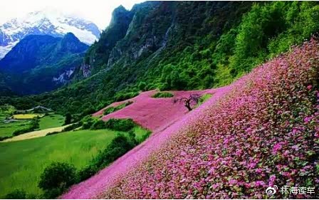 花甸坝由大、小花坝组成,景观有所不同。大花田坝由冰川作用形成,海拔2900米呈南北走向,它西面的山峰终年白雪皑皑。40条大小的溪流汇聚成了万花溪,在现在这个季节是最美的,山茶花、杜鹃花、龙爪花、还有各种叫不出名字的花,简直美呆了。时不时还会有幽幽的香气向你扑面而来,让人如痴如醉。