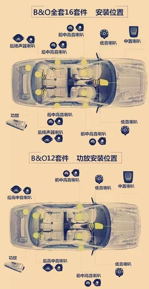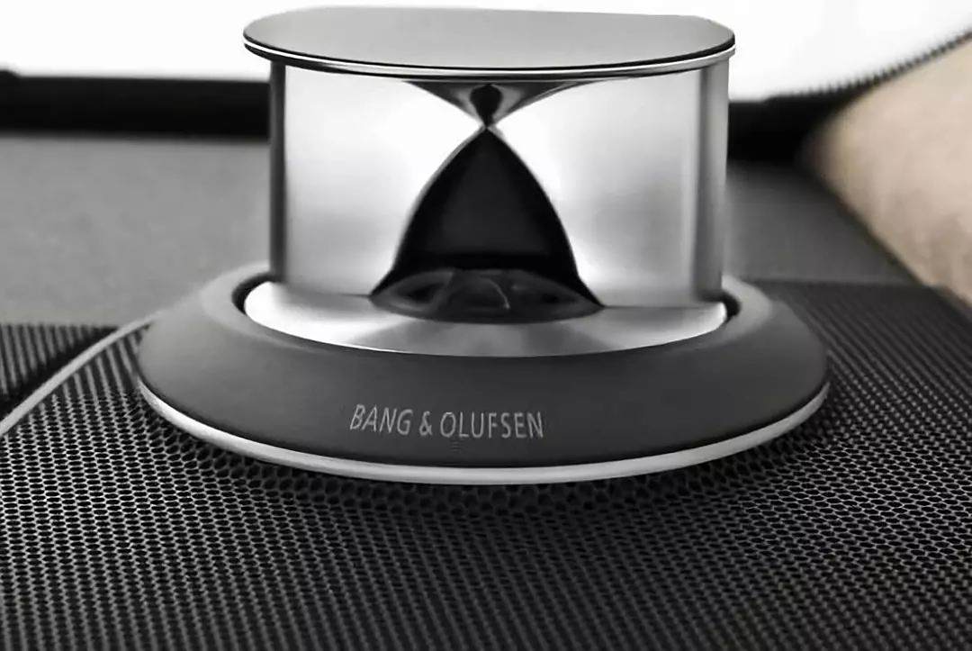 B&O在车载音响中提供有16个扬声器以及一个1200W功放,16个扬声器分为:2个低音、7个中音、7个高音,分别装置于:中控台、前座椅下方、前门A柱、前门、后门、后窗台、后备箱(功放)。