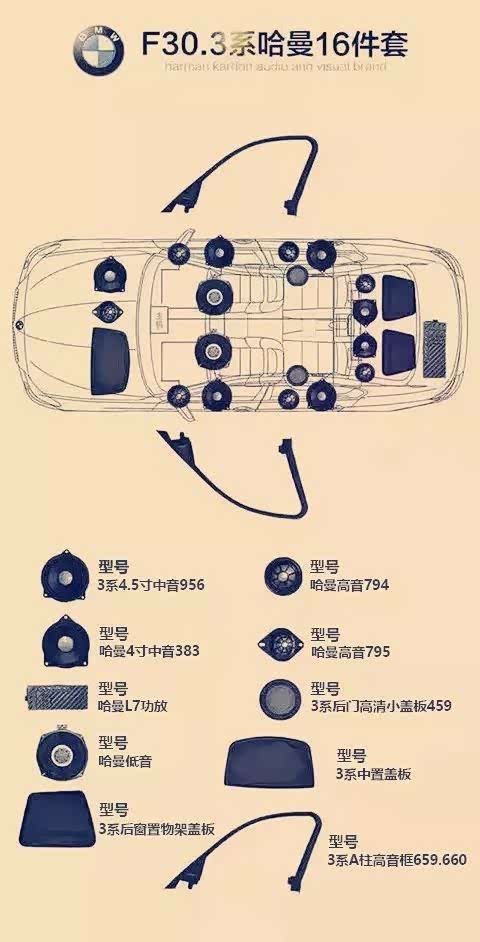 这里需要注意的是,安装12、16件套哈曼卡顿音响需要编程,安装16件套则需要在车内饰板开孔。