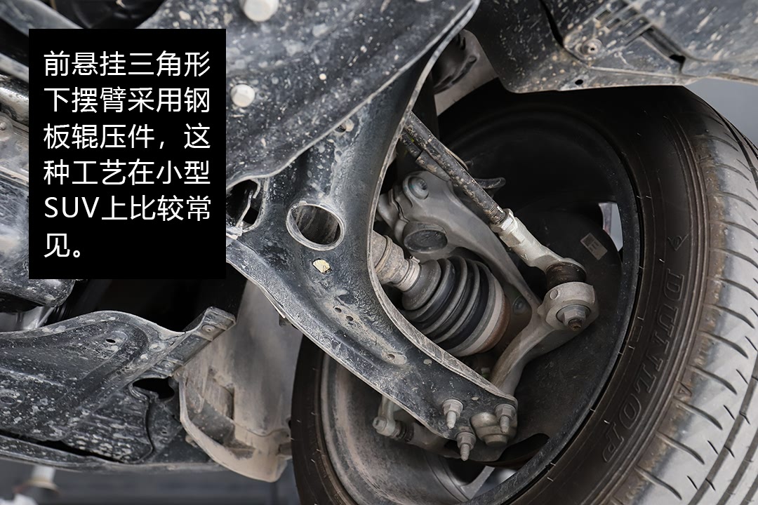 前悬挂是非常典型的麦弗逊式,减振器和弹簧同轴设计,构成俗称的弹簧腿,承受车轮上下振动力量。车轮水平方向的受力则由下摆臂承担,下摆臂是单片钢板冲压成型的三角形结构,相比对手们(如缤智)采用封闭界面三角臂,柯珞克这个单片钢板冲压看着有点单薄,不过防倾杆倒是蛮粗,挽回一些好印象。