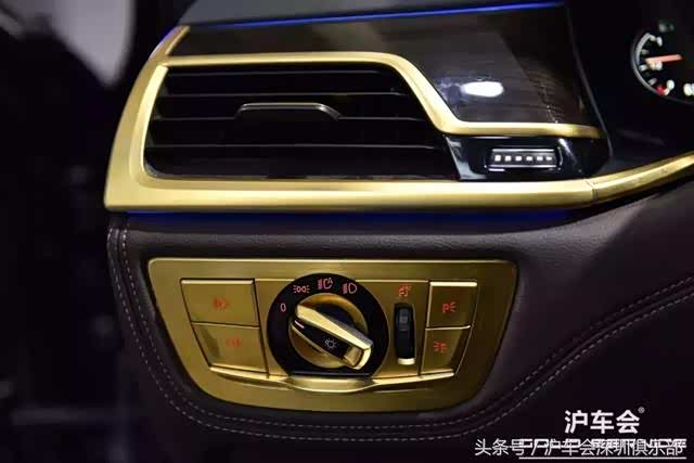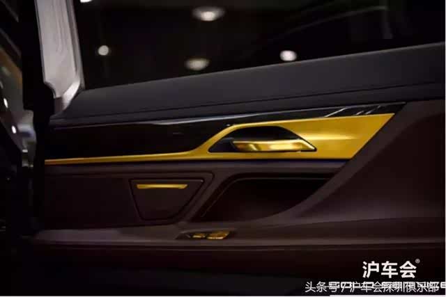 宝马新7系原车黑色与咖啡色内饰搭配,但车内的银色镀铬件还是让车子整体缺乏个性色彩。这次宝马新7升级改装内饰,主要将原车的银色金属件改为金色镀金。