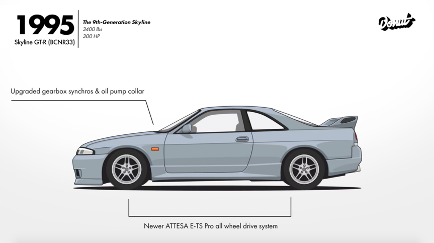 第九代Skyline R33于1993年8月推出,它的重量比R32稍重。R32虽然取得了一系列骄人的战绩,但它也并不完美,所以日产在R33身上做了一些改变。更宽的车身和加长车身,给了R33更加优秀的车身比例。保险杠的开孔更大和更加夸张的车身流线,所有的改变都是为了让R33能拥有最极致的空气动力学。Skyline GT-R(BCNR33)拥有300马力的最大输出功率,以及当时最新的ATTESA E-TS Pro四驱系统。