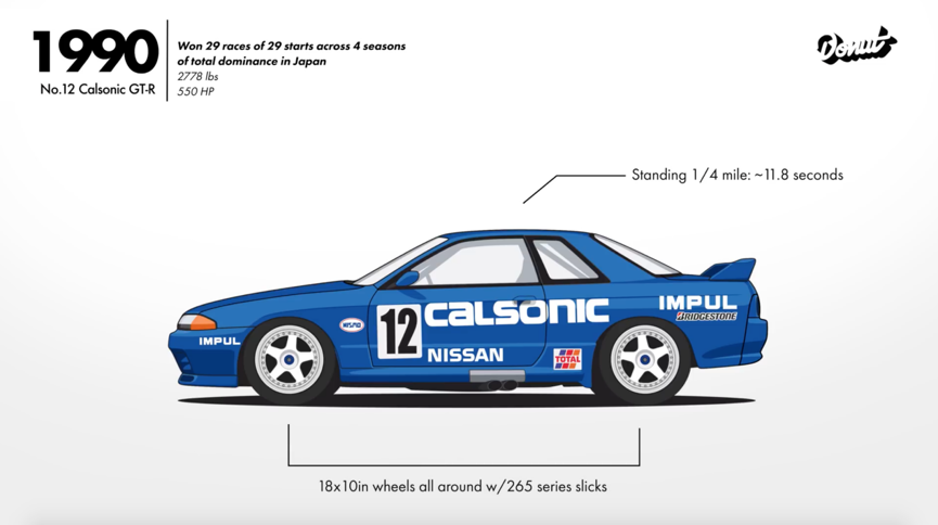 当年R32的主要出口国是澳大利亚,在澳洲当地名声很快便传递开来,它来到这个新环境并没有“水土不服”,而是迅速进入状态,统治了整个赛车场。最终像是Group A Touring Car racing这样的比赛也不得不改变规则来限制R32。这台Calsonic GT-R(BNR32)车重为1260公斤,拥有惊人的550马力,四分之一英里加速时间仅为11.8秒,这个成绩放到现在依然是名列前茅。在澳洲,人们管它叫“哥斯拉”,足以见得它在澳洲赛车场上的统治地位。